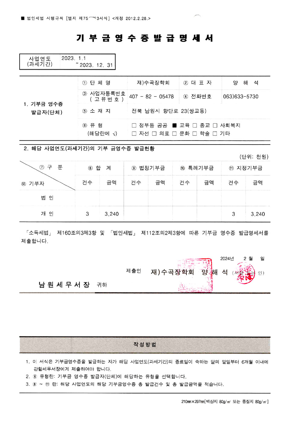 2023년도 기부금 영수증 발급 명세서 페이지 정보 작성자 수곡장학회 댓글 댓글 0건 조회Hit 339회 작성일Date 24-02-27 11:14 본문 2023년도 기부금 영수증 발급 명세서 목록 댓글 0 댓글목록 등록된 댓글이 없습니다.